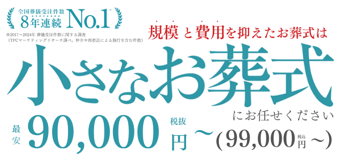 「小さなお葬式」では、全てのプランにおいてお葬式に必要な物品・サービスを含んでいるため、多くの場合、セットプラン料金内でお葬式を行っていただけますが、お住まいの地域や、火葬場の空き状況、その他お客さまがオプションサービスをご希望される場合などは、別途費用がかかります。